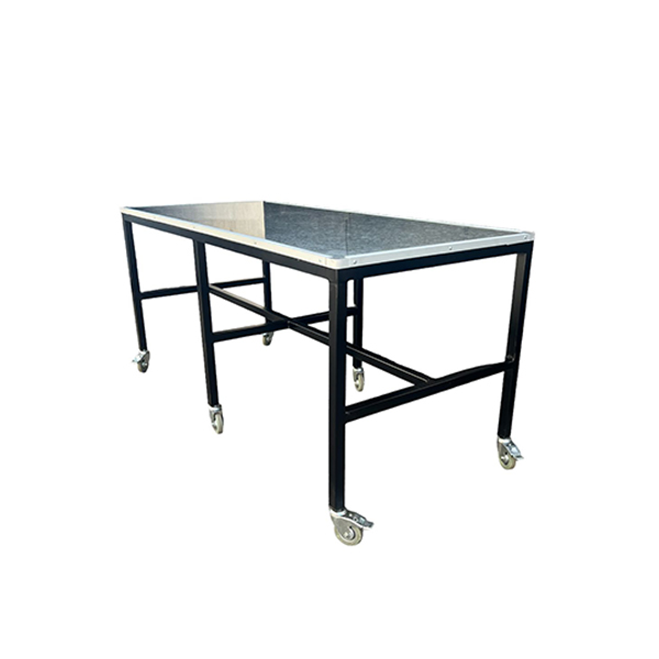 Mesones o mesa de trabajo en estructura de acero con superficie de madera y plancha galvanizada. 6 ruedas 4″ de las cuales 2 giratorias y 4 con frenos.